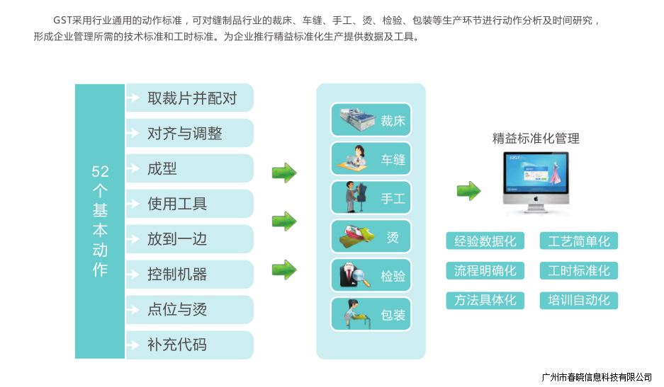 昊天制衣通过引进PA集团GST标准化管理系统,实现工时标准化、优化生产工艺流程、实现管理精细化,为业务发展提供更加有力的支撑,发挥业务板块与实业板块之间的桥梁纽带作用。绿色生产,公司把传统产业优势和转型升级结合起来,对客户每一项新需求,新概念,新想法快速作出反应。通过GST标准,将全面管理公司的各种工艺技术标准,以及建立完善的标准工时核算和应用体系,进一步通过对技术人员(IE人员)、管理人员的GST分析培训,逐步深入标准化的应用,推进标准化,自动化,可视化,信息化改善,充分发挥信息技术在生产过程中的作用。